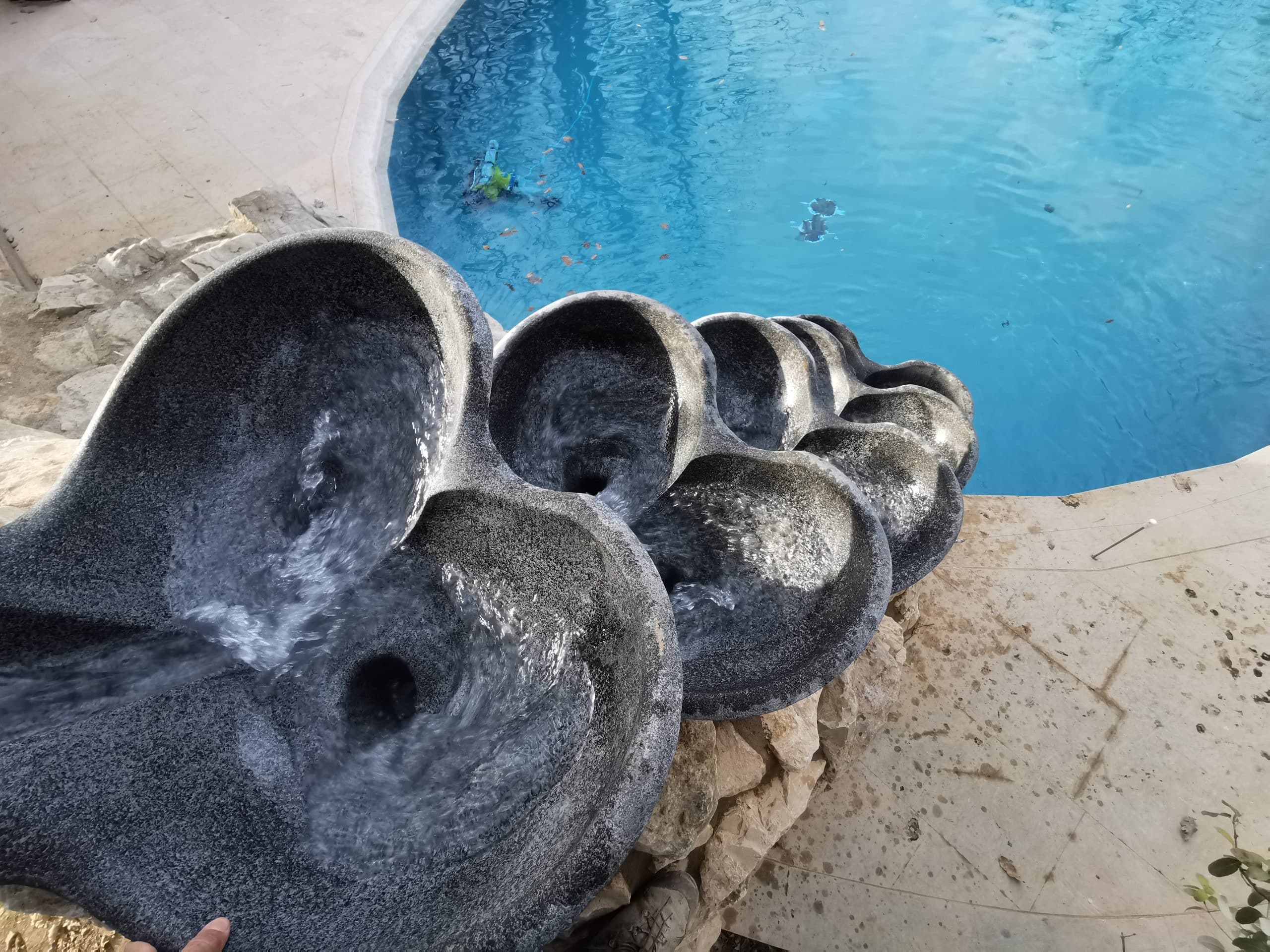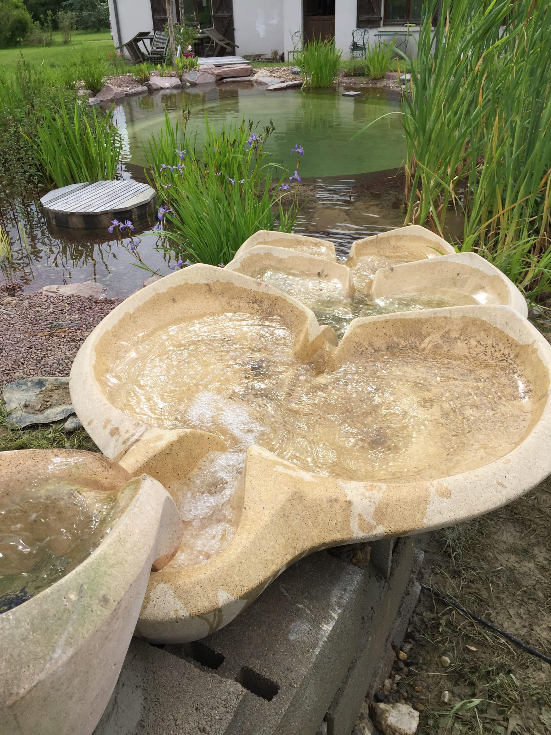 La Dauphin donne une qualité de présence particulièrement relaxante et gracieuse. L’eau s’enroule dans une cavité et s’étend à l’opposé sur un large pétale en va et vient. Particulièrement sculpturale, cette pièce meuble délicatement un hall d’entrée, un espace de repos, une terrasse… où il fait bon laisser couler le temps. Elle peut se poser sur un bassin ovale (1m70 de coté) ou s’adosser à une rocaille.